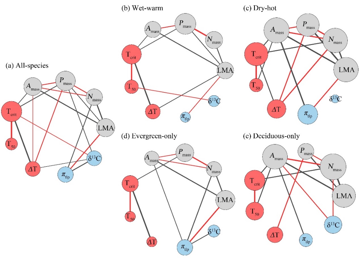 (a)所有物种、(b)湿暖生境物种、(c)干热生境物种、(d)常绿物种和(e)落叶物种。叶片耐旱(蓝色)、耐热(红色)和经济性状(灰色)之间的正相关(红色线)和负相关(黑色线)由线条表示,线条宽度代表相关性强度。缩写:膨压丧失点时的叶片水势(πtlp)、叶片长期水分利用效率(δ13C)、光系统II量子传递效率开始下降的温度(Tcrit)、光系统II量子传递效率下降50% 时的温度(T50)、Tcrit和T50之间的温度范围(ΔT)、比叶重(LMA)、单位质量叶片氮含量(Nmass)、单位质量叶片磷含量(Pmass)、单位叶片质量的最大光合速率(Amass)。