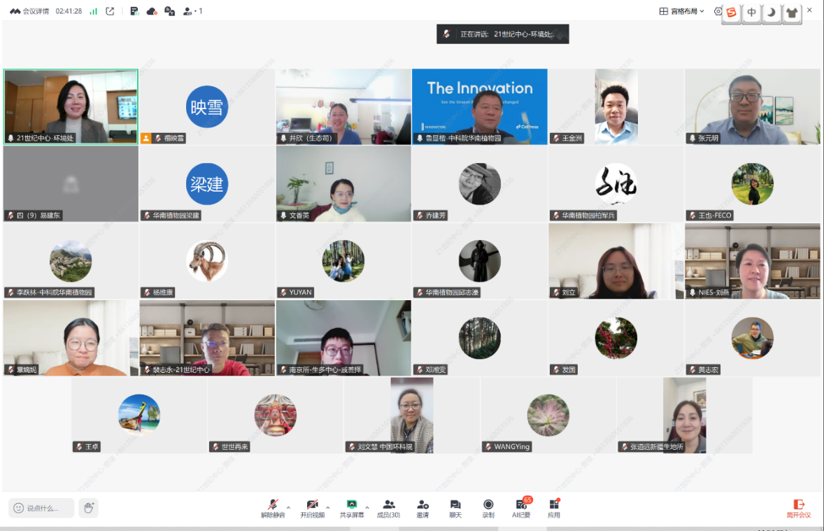 中国21世纪议程管理中心生态环境处刘荣霞副处长主持本次会议。会议得到了生态环境部生态司的大力支持,汇聚了来自生态环境部、中国科学院、中国环境科学研究院等机构与科研单位的三十余位领导与专家学者,围绕生物多样性保护与恢复的标准化、国际化、实施路径以及昆蒙框架履约等开展深度交流。