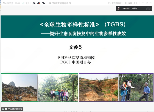 此次研讨会设置了五场专题报告与一场集中研讨。中国科学院华南植物园文香英高工作了题为《全球生物多样性标准(TGBS)——提升生态系统恢复中的生物多样性成效》的开场报告,系统梳理了国际生物多样性标准的最新进展、核心指标体系及其在生态修复中的实践路径,并结合国内外典型案例,深入解析了标准评估与认证的具体流程。报告指出我国已在造林规模和绿色金融领域走在前列,TGBS可作为重要工具,助力我国在生物多样性保护成效的质量方面进一步引领全球。同时转达了BGCI秘书长Paul Smith博士的期望:希望中国将TGBS纳入政策体系,并愿意支持在中国政府机构内设立TGBS HUB并开展评估师培训工作。