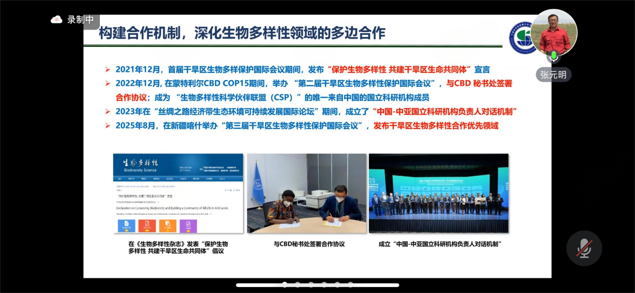 中国科学院新疆生态与地理研究所所长张元明研究员在报告中系统阐述了干旱区生物多样性保护所面临的多重挑战与关键进展。他指出,干旱区生态系统具有独特的脆弱性与不可替代性。为此,我国正积极填补数据与科研空白,推动区域性保护策略与全球标准深度协同,为兑现“昆蒙框架”贡献干旱区智慧与方案。