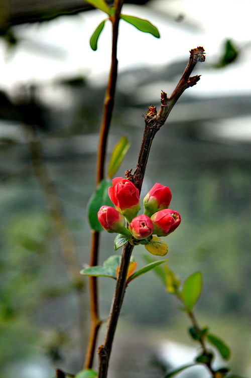 贴梗海棠(Chaenomeles speciosa),蔷薇科木瓜属落叶灌木,其枝杆丛生,枝上有刺;花梗极短,花朵紧贴在枝干上,故名。贴梗海棠之名为大家广为熟悉源于明代《群芳谱》所载“海棠有四品,皆木本,西府海棠、垂丝海棠、木瓜海棠和贴梗海棠。”其实贴梗海棠和木瓜海棠都是木瓜属植物,不像西府海棠、垂丝海棠(二者均为苹果属)一样可以直接称为海棠或者海棠花,叫的时候必须加个定语,以示区别。