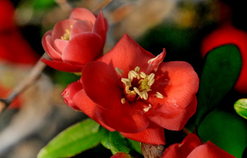 作为传统海棠的一种,贴梗海棠也是我国的传统名花之一,素有“国艳”、“花中神仙”、“花贵妃”之誉。历代文人墨客题咏不绝。陆游诗云:“虽艳无俗姿,太皇真富贵。”形容海棠艳美高雅。宋代刘子翚[huī] 诗云:“幽姿淑态弄春晴,梅借风流柳借轻,......几经夜雨香犹在,染尽胭脂画不成。”形容海棠似娴静的淑女,集梅、柳优点于一身而妩媚动人,雨后清香犹存,花艳难以描绘。一代大文豪苏东坡也为之倾倒,“只恐夜深花睡去,故烧高烛照红妆。”因此海棠雅号“解语花”。与其他几种相比,贴梗海棠的色彩更为鲜明浓郁,令人神为之夺。