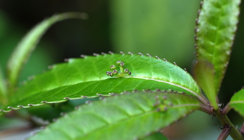 春天里的华南植物园是花的世界,放眼望去,姹紫嫣红、千姿百态、让人目不暇接。就在这百花丛中,总有一些是让人“不看不知道、一看还真奇妙”的稀罕玩意儿。这不,在温室群里的高山温室里就有那么一种。此花极不显眼,如果你是张着眼睛寻找像玫瑰或杜鹃那样的花,保证它在你眼前都会错过。可一旦发现它了,人们大多都会或高或低的“呀”一声,惊奇不已!原来它的花是开在叶片上,一般的花都开在枝头,这叶上开花却是极为罕见。花很小,凑近了看,倒也很是精致,数朵浅绿色的小花聚生在叶片的中央,每朵花上面点缀着三枚造型别致的白色花蕊,十分可爱。这有趣的植物就是:西藏青荚叶(Helwingia himalaica Hook.f.et Thorns.ex Clark.),人称“叶长花”。
