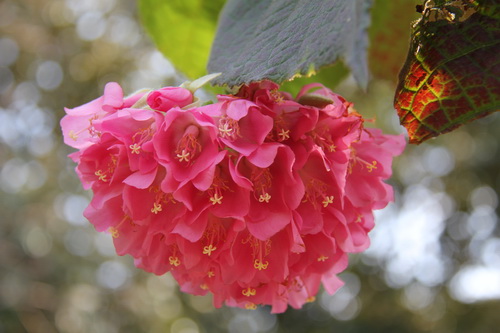 非洲芙蓉(Dombeya wallichii (Lindl.) Benth. & Hook.f.)是梧桐科非洲芙蓉属的常绿灌木或小乔木,开花时,常常的花轴上抽出等长的小花梗,可有20多个小花,悬吊而下,极像花球。在香港,人们称之为“吊芙蓉”,其他地方不少人称之为“百铃花”——可爱动听的名字。英语里,人们称之为“Pinkball”(粉红球)、 “Scarlet Dombeya”(绯红的非洲芙蓉)或“Tropical Hydrangea”(热带绣球花)等名。