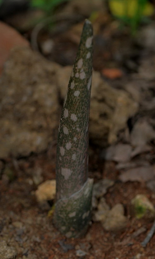 疣柄魔芋(Amorphophallus virosus)为天南星科魔芋属的植物,“疣柄”二字取自它有“疣”突的花序柄和叶柄,“魔芋”则是跟随家族的传统称呼。它还有个不讨人喜欢的名字--尸花,源于它开花时腐尸般的臭味,此味道让它无法成为受宠的家庭观赏植物。其实被封称“尸花”也够冤枉它的,因为它只不过会在花开后短短的几个小时内才会发出让人难以忍受的恶臭而已。