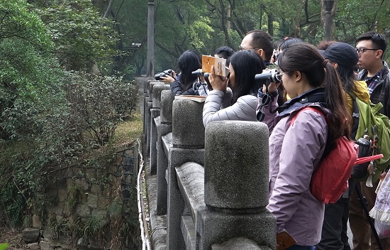 2月14日上午,参加华南植物园观鸟成人课程班的学员们,收获了10多个鸟种,远超出科普老师一开始定出的目标6种鸟。看身形大小、飞行姿态、颜色特征,听鸟声辨识,科普老师带大家沿着棕榈园一路进行户外观鸟。貌不惊人的乌鸫,在不同季节里,却有着变化多样的叫声,让人晕头转向。大拟啄木鸟粗嘎嘹亮的声音,过耳难忘。而美丽的红嘴蓝鹊,也能发出不同嘈杂的叫声和哨声。