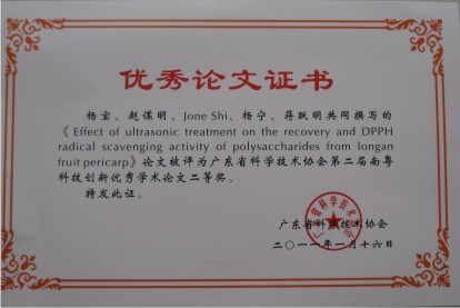 由广东省科学技术协会举办的“第二届南粤科技创新优秀学术论文”评选活动近期揭晓结果。经评审委员会评审,在参选的300多篇论文中,最终评选出一等奖论文5篇、二等奖论文20篇、三等奖论文55篇。其中,经广东省植物生理学会推荐,华南植物园杨宝副研究员、蒋跃明研究员等人共同撰写的论文“Effect of ultrasonic treatment on the recovery and DPPH radical scavenging activity of polysaccharides from longan fruit pericarp”荣获粤科技创新优秀学术论文二等奖。