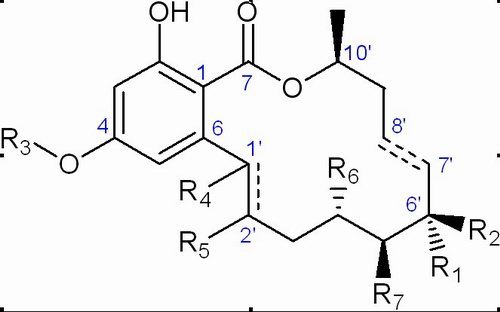 β-间二羟基苯甲酸大环内酯(β-Resorcylic acid lactones,RALs)是一类结构十分独特的苯并14元环大环内酯,自从1953年Delmotte等首次分离得到radicicol以来,人们从天然产物中一共分离得到近30个RALs,它们基本上都含有一个1、2、4、6位四取代的苯环,苯环1位连有一个酯基,6位与一个长碳链相连,并通过碳链的10'位与1位羰基连接形成14元环大环内酯。在长碳链的9'位均为亚甲基,10'位连有甲基,其它位置则连有羟基、酮基、环氧基等含氧取代基,或碳碳双键等。