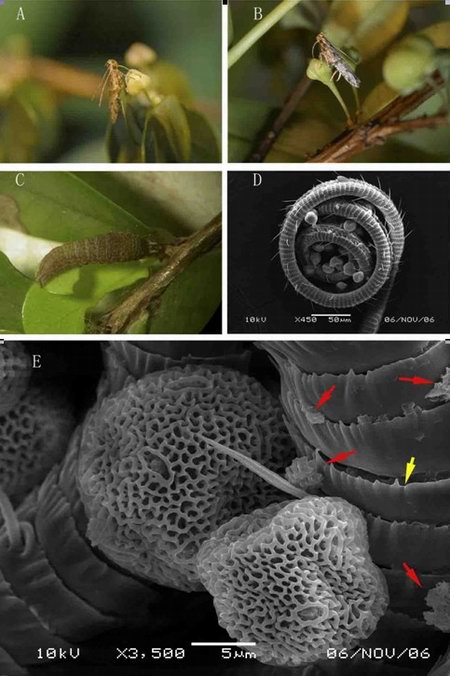 D角麦蛾口器上携带寄主植物花粉;E示角麦蛾独特口器上完整的花粉和分解的花粉块。