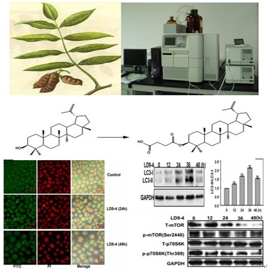 自噬在肿瘤细胞中发挥何种作用学术界一直存在争议,近期研究表明自噬可以导致肿瘤细胞死亡,因而成为抗癌药物的热点。花榈木(Ormosia henryi Prain)是一种广泛用于癌症疼痛及骨流失疾病治疗的中草药。研究组从中分离鉴定出23个化合物,包括1个结构新颖的多异戊烯基取代的异黄烷,它在体外表现出很强的抑制A549肿瘤细胞增殖的活性。随后对花榈木的活性成分及其半合成衍生物的抗癌作用机制进行深入研究,发现其通过诱导“自噬”(autophagy)而导致癌细胞死亡,这与传统抗癌药物诱导细胞凋亡的作用机制不同。这些化合物正是通过产生活性氧自由基破坏线粒体,引起内质网应激,最终导致细胞自噬死亡。目前基于凋亡机制的抗癌药物由于过量使用而产生的普遍“耐药性”已引起医药界广泛关注,而诱导自噬的抗癌药物才刚刚兴起,一旦通过临床试验获准上市,无论是单独使用或与凋亡类抗癌药联合使用,将可大大减少耐药性而增强疗效,花榈木’自噬’ 抗癌活性成分的发现为抗癌药物的研究提供了一个新思路。