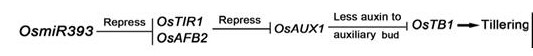 华南植物园分子生物学与遗传改良研究中心植物生理生化研究组的夏快飞副研究员和硕士研究生王忍等在张明永研究员指导下对水稻OsmiR393的生物学功能进行了详细研究。经过研究发现:OsmiR393可直接作用于2个水稻生长素受体基因OsTIR1和OsAFB2的mRNA,进而调节它们的表达;超表达OsmiR393的水稻的生长素运输基因OsAUX1及一个分蘖抑制基因OsTB1的表达显著性降低。同时发现超表达OsmiR393的转基因水稻的两个新的表型(分蘖数增加和抽穗提前);然而超表达OsmiR393引起水稻对盐和干旱胁迫的抗性下降,对生长素敏感性降低。根据研究结果提出了OsmiR393控制水稻分蘖的基因线路途径的假设(图1),即OsmiR393通过下调OsTIR1和OsAFB2的表达降低转基因植株对生长素的信号敏感性;从而造成生长素转运基因OsAUX1的表达下降且导致植株对生长素的运输能力下降,进而造成分蘖芽内的生长素含量较低,最后促进分蘖芽生长,导致植株分蘖增加。