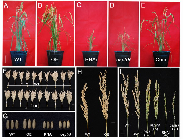 图片说明:A:野生型对照(ZH11);B:超表达植株;C:RNAi植株;D:突变体植株;E:突变体互补植株;F:超表达植株与对照每株穗数比较;G:不同转基因植株米粒大小比较;H:超表达植株与对照穗大小比较;I:不同转基因植株穗大小比较(依次为对照、互补、RNAi杂合、突变体杂合、RNAi纯合、突变体纯合植株)