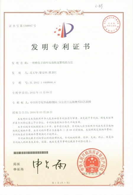 4月21日收悉,由华南植物园禹玉华等科研人员完成的“一种橙花羊蹄甲高效快速繁殖的方法”获得国家发明专利授权(专利号:ZL 201210448990.6)。
