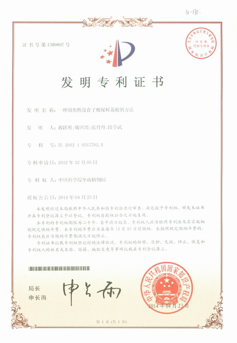 5月22日获悉,由中科院华南植物园蒋跃明、段学武等科研人员完成的“一种用焦性没食子酸保鲜荔枝的方法”获得国家发明专利授权(专利号:ZL201210517762.X)。