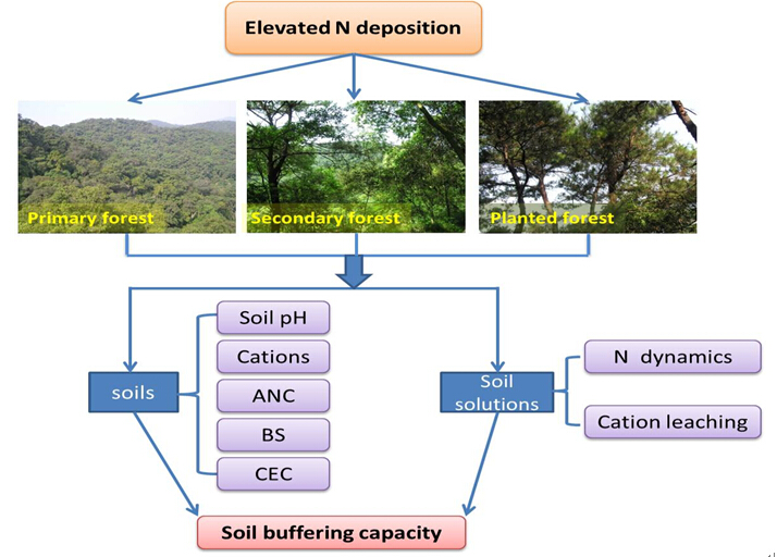长期氮沉降对中国南方典型森林(原始林、次生林和人工林)土壤缓冲能力影响研究的示意图