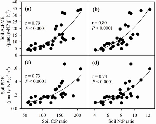 图:0-15 cm矿质土壤中酸性磷酸单酯酶(AcPME)和磷酸二酯酶(PDE)与土壤C:P比和N:P比的关系