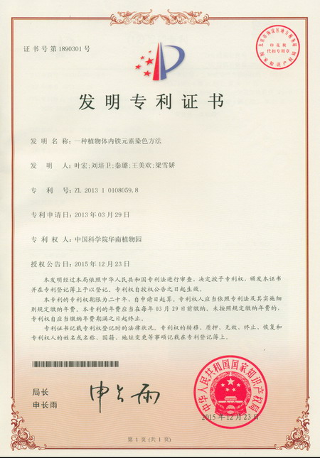 1月15日获悉,由中科院华南植物园叶宏研究员等科研人员完成的“一种植物体内铁元素染色方法”获得国家发明专利授权(专利号:ZL 201310108059.8)。