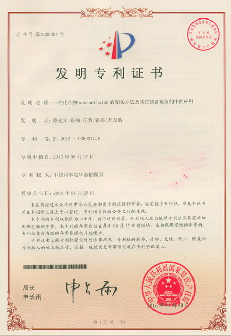 5月17日获悉,由中科院华南植物园谭建文研究员等科研人员完成的“一种化合物macranthoin G的制备方法及其在制备抗菌剂中的应用”获得国家发明专利授权(专利号:ZL 201310380347.9)。