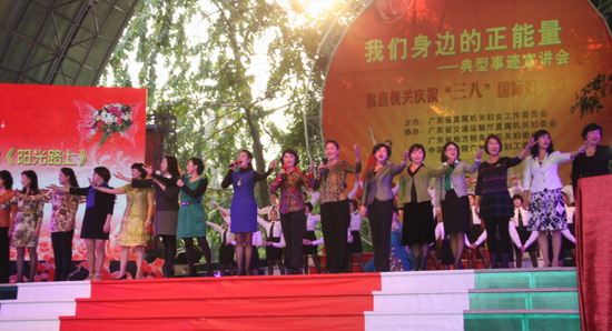 宣讲会上,省第二人民医院急诊科护士长蒋晓红等四位同志以现场宣讲和访谈的形式重现他们在工作岗位上的一个个真实故事,向我们展示她们在工作和生活中的自尊、自信、自立、自强,展示在实现“三个定位、两个率先”总目标中的“半边天”作用,积极弘扬了中华民族传统美德和时代新风。女性同胞是半边天,她们的喜怒哀乐直接影响着全社会的幸福与和谐。在这个属于全天下女性的日子里,省交通厅、省林业厅、省水利厅、广州海关和黄埔海关等单位以汉剧、小品、快板、舞蹈、诗歌等多种文艺形式倾情演出,宣传着身边的“正能量”,深情并茂抒发对女同胞美好的节日祝福,寄语对未来幸福生活和各项事业发展的美好祝愿。最后,省直机关妇工委全体常委共同高歌《阳光路上》,将宣讲会推向了高潮。