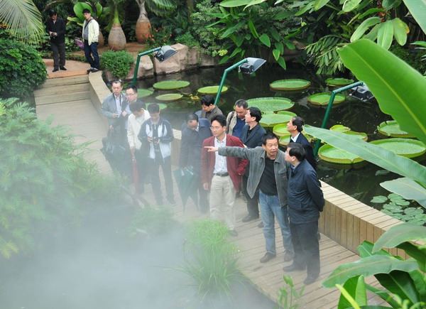 座谈会后,代表团一行重点参观考察了温室群景区。考察途中,张卫国高度赞扬了景观温室的规划设计、造景艺术和园林布局,特别对温室的运营成本低、设施设备能耗小、生态环保等建设特点赞叹不已。