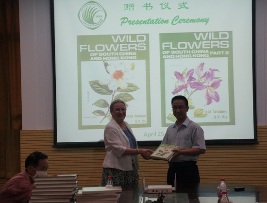 4月25日,英国著名水彩画家Mrs. Beryl Walden赠书仪式在华南植物园隆重举行。Mrs. Beryl Walden的女儿Vanessa女士作为家族代表将已故母亲与美国哈佛大学植物学家胡秀英博士合作编撰的《华南暨香港四季花画谱》及其第二册共两卷各200册赠送给华南植物园,再分赠给有关单位和个人。园副主任傅声雷代表华南植物园接受了赠书,并向Vanessa女士及其母亲表达了最诚挚的敬意和感谢,并回赠了赠书证明。华南植物园老一辈科学家和部分年轻科研人员参加了赠书仪式并接受了赠书。