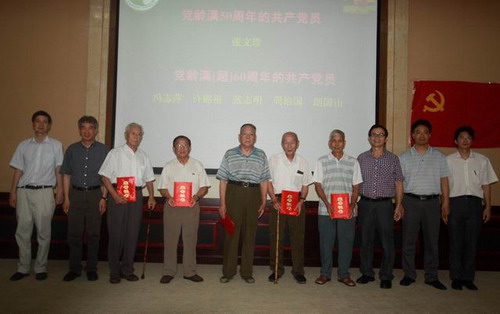 园党委委员向新增的党龄满50周年及党龄满(超)60周年的党员颁发纪念证书并合影