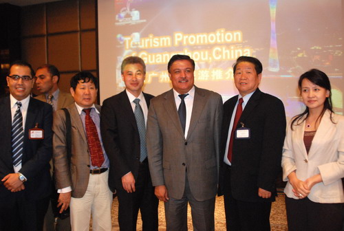 埃及新闻发布会现场(中国文化参赞陈冬梅 右1、广州市旅游局副局长李志新 右2、埃及旅游部副部长纳赛尔 右3、中国文化参赞刘天明 右4、华南植物园蒋厚泉 右5)