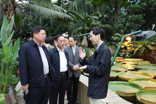 黄日波一行首先参观了华南植物园大型景观温室群和苏铁园、兰园、药园等多个专类园区,对华南植物园中西合璧的园林造景、丰富多彩的植物种类、崇尚自然的园艺布局以及浓厚久远的文化底蕴表示了高度赞赏。