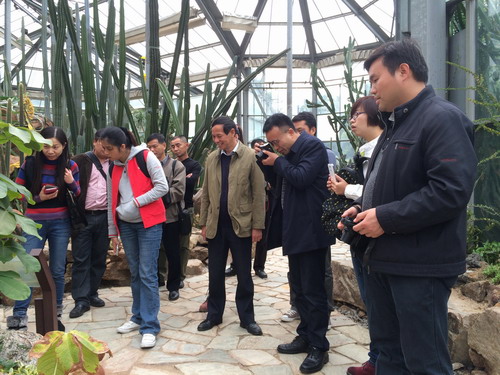 蒋厚泉向客人简要介绍了华南植物园的基本概况、主要研究领域及代表成果、科普传播与旅游开放等情况,并重点介绍植物园温室群景区及各主要专类园区的设计建设及后期维护工作。随后,蚁伟民陪同李伟进一行参观考察了华南植物园温室群景区及各主要专类园,双方就园林植物新品选育、园林景观优化等方面,进行了广泛的探讨和交流。