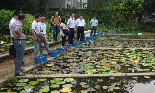 考察期间,代表团一行参观了华南植物园水生植物专类园、水生植物繁育基地及水生植物科研设施。李常官表示,此次考察主要是了解华南植物水生植物开发利用情况,希望华南植物园在玉林市“五彩田园”现代特色农业示范区中的“荷之源”和“荷塘月色”景区建设给予技术支持,同时感谢陈磊博士在两个景区先期建设中给予的规划指导。随后,双方就景区景观营造、水生植物物种选择和配置、产品开发和后续维护管理等方面开展交流,并洽谈了合作方式。