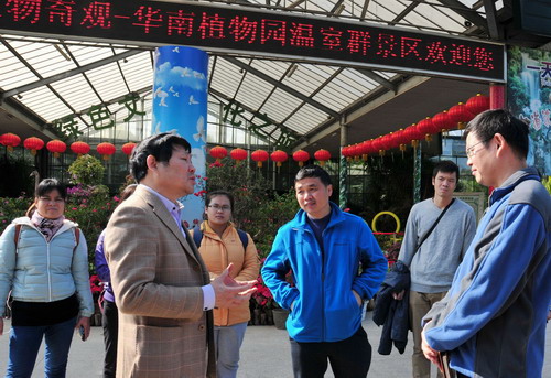 代表团一行先后参观了展览温室群、木兰园、珍稀濒危繁育中心、兰园、苏铁园等专类园区和景点。参观途中,蚁伟民侧重介绍了华南植物园的园区分布、历史发展、科学研究方向、物种引进和保护、科普教育等情况。蒋厚泉建议利用华南园在国际上的影响力,尽快召开青秀山景区规划建设的国际评估会议,力争景区的软、硬件达到国际一流水平。