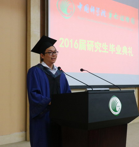 吴靖滔作为毕业硕士生代表,就自己硕士三年学习的过程与经验同大家进行了分享,希望能给大家一些启发与建议。他在感谢父母,感谢导师,感谢课题组的师兄师姐和身边的同学朋友的同时,更感谢中科院华南植物园这一个平台,让他在科学研究的道路上无怨无悔。