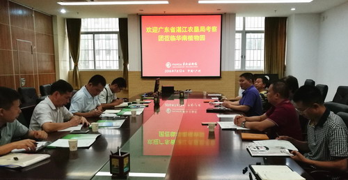 7月13日,广东省湛江农垦集团(农垦局)考察团在局长黄香武率领下访问中科院华南植物园。受园主任任海委托,华南植物园副主任闫俊华,叶清、吴国江、廖景平、李志安、陈磊、王克亚等专家和领导热情接待了来宾。