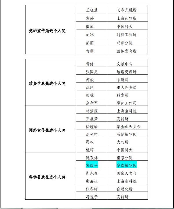 为鼓励在中国科学院科学传播工作中做出突出成绩的集体和个人,科学传播局、国际合作局和监督与审计局,共同组织开展了2014局、国际合年度中国科学院科学传播奖的评选工作,经评审工作领导小组审定,中国科学院科学传播局于近日颁发《关于表彰2014-2015年度中国科学院科学传播获奖单位和个人的通报》(传播字﹝2016﹞4号)”。中科院华南植物园荣获“科学传播先进单位奖”;同时周飞同志荣获“新闻宣传先进个人奖”、宋政平同志荣获“科学传播先进个人奖”。